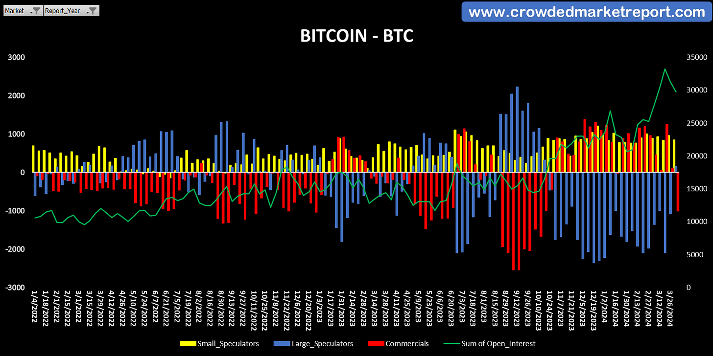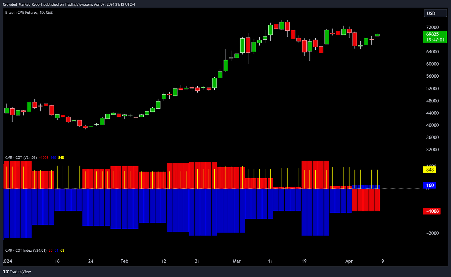 Today we highlight positioning in Bitcoin Futures. The contract is up over 50% year-to-date and it seems every dip is being bought as it trades near all-time-highs. We did see price get rejected as Bitcoin attempted to make new highs in late March and the start of April but today it shows strength to the upside. It is worth noting that as of April 2nd, the Commitments of Traders (COT) report that provides trader positioning data, showed Commercial Traders (red column), also known as Hedgers, became net-short Bitcoin futures, for the first time in 2024. The chart below from TradingView with the CMR COT indicator clearly shows Large Speculators (blue column) bought the dip as of Tuesday, April 2nd, which inversely caused Commercials to become net-short providing liquidity to the contract.