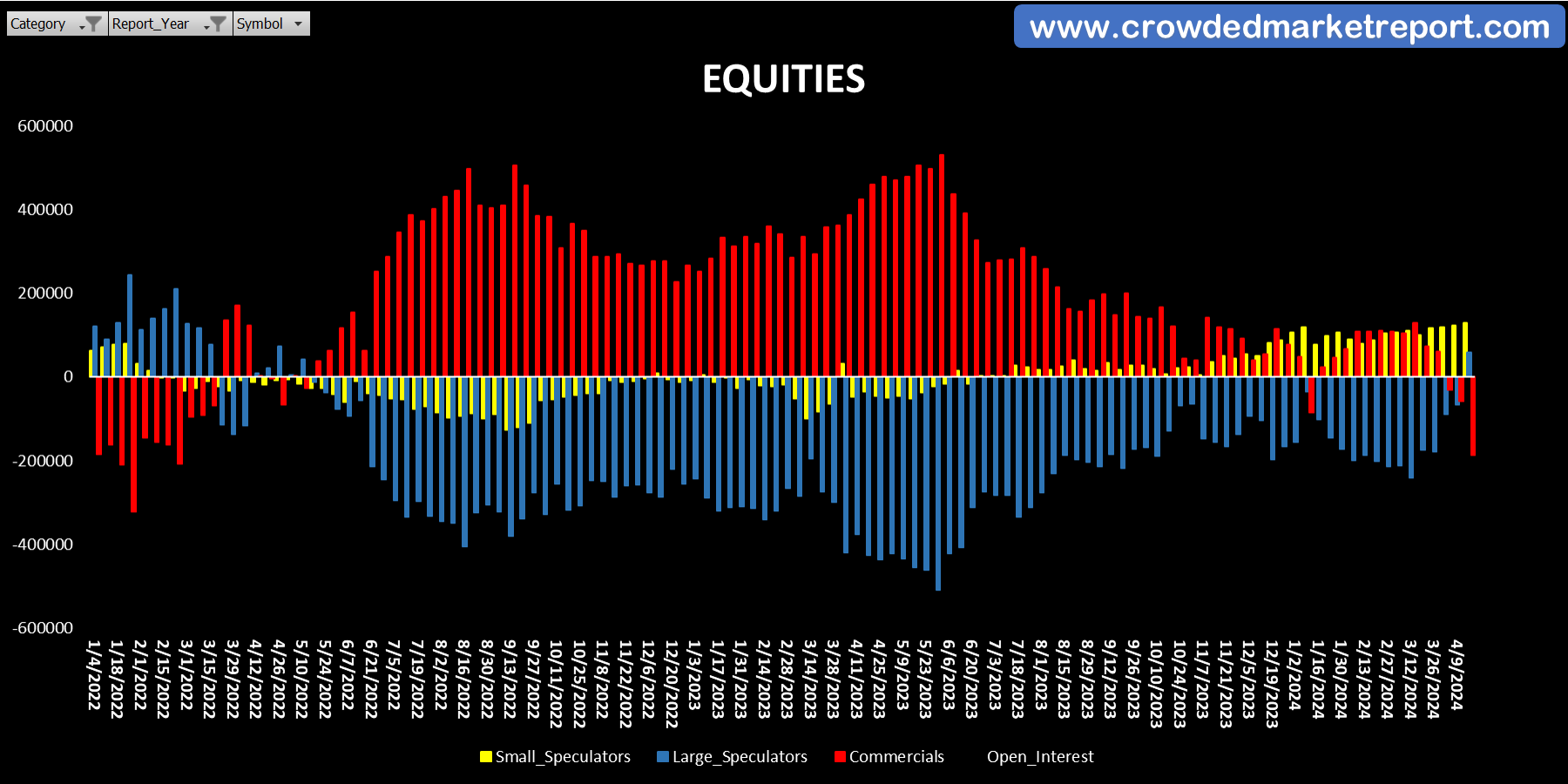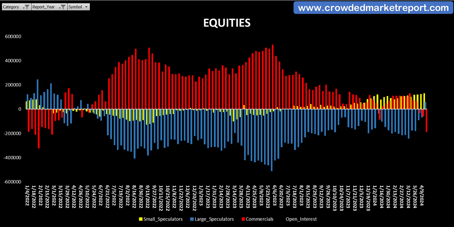 The overall Equities trader positioning chart became more extreme and honestly scary this past Friday when the new Commitments of Traders (COT) data was released. Starting three weeks ago, Commercial traders became net-short for the first since the start of 2024, but this time, the selling continued the following two weeks, where there is an obvious change in trader behavior. If Commercials are this net-short, Speculators are now net-long, since total Speculator (both Small and Large) positioning is the inverse of Commercial traders. That means Speculators are buying a dip in the stock market. The Equities CMR COT chart shown below represents total trader positioning in futures for the four major indices: Nasdaq, S&P, DOW and Russell. Does that mean all four are positioned the same? Obviously not, but it provides a consensus on how traders are positioned in Equities.