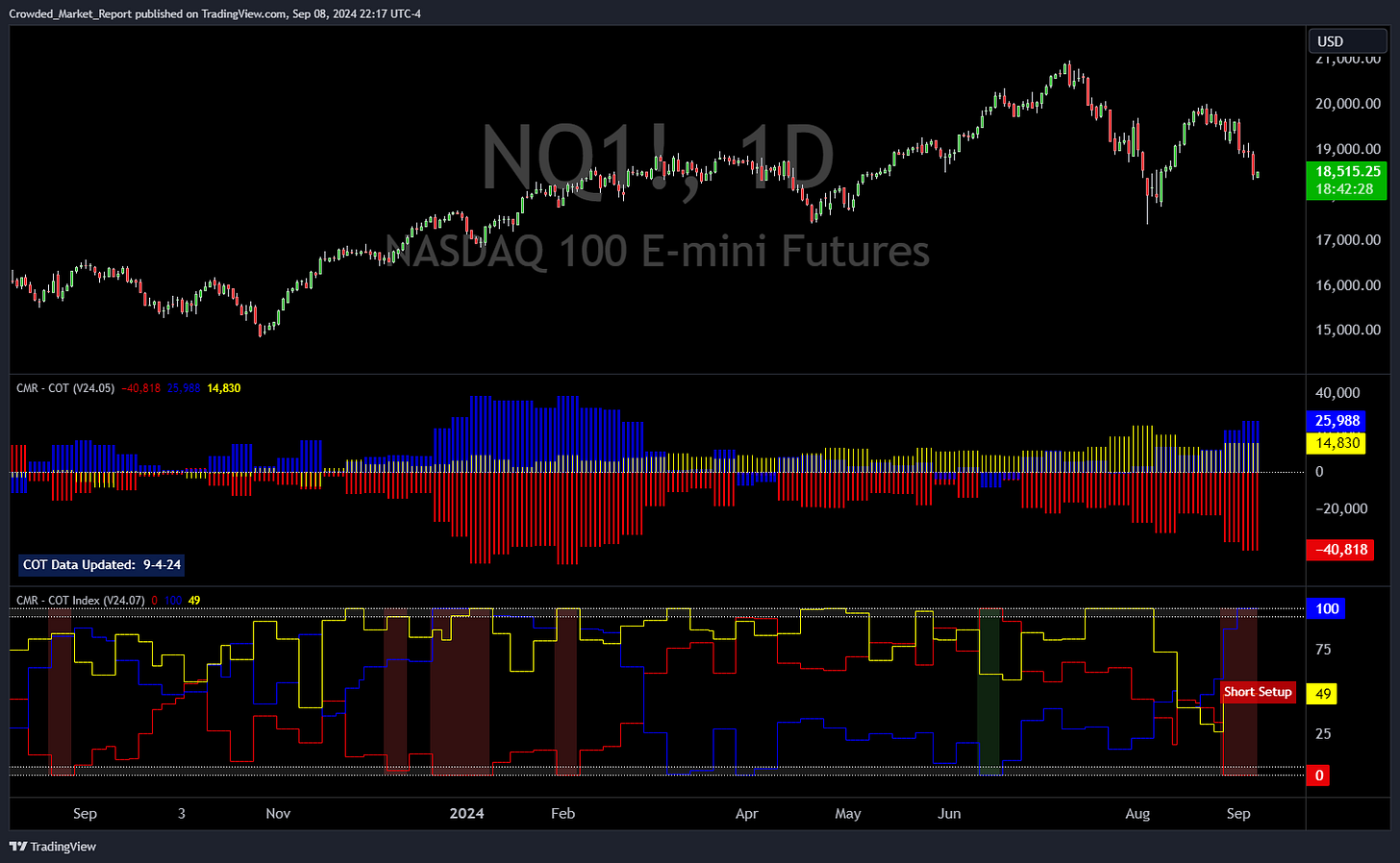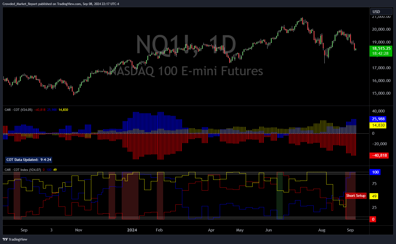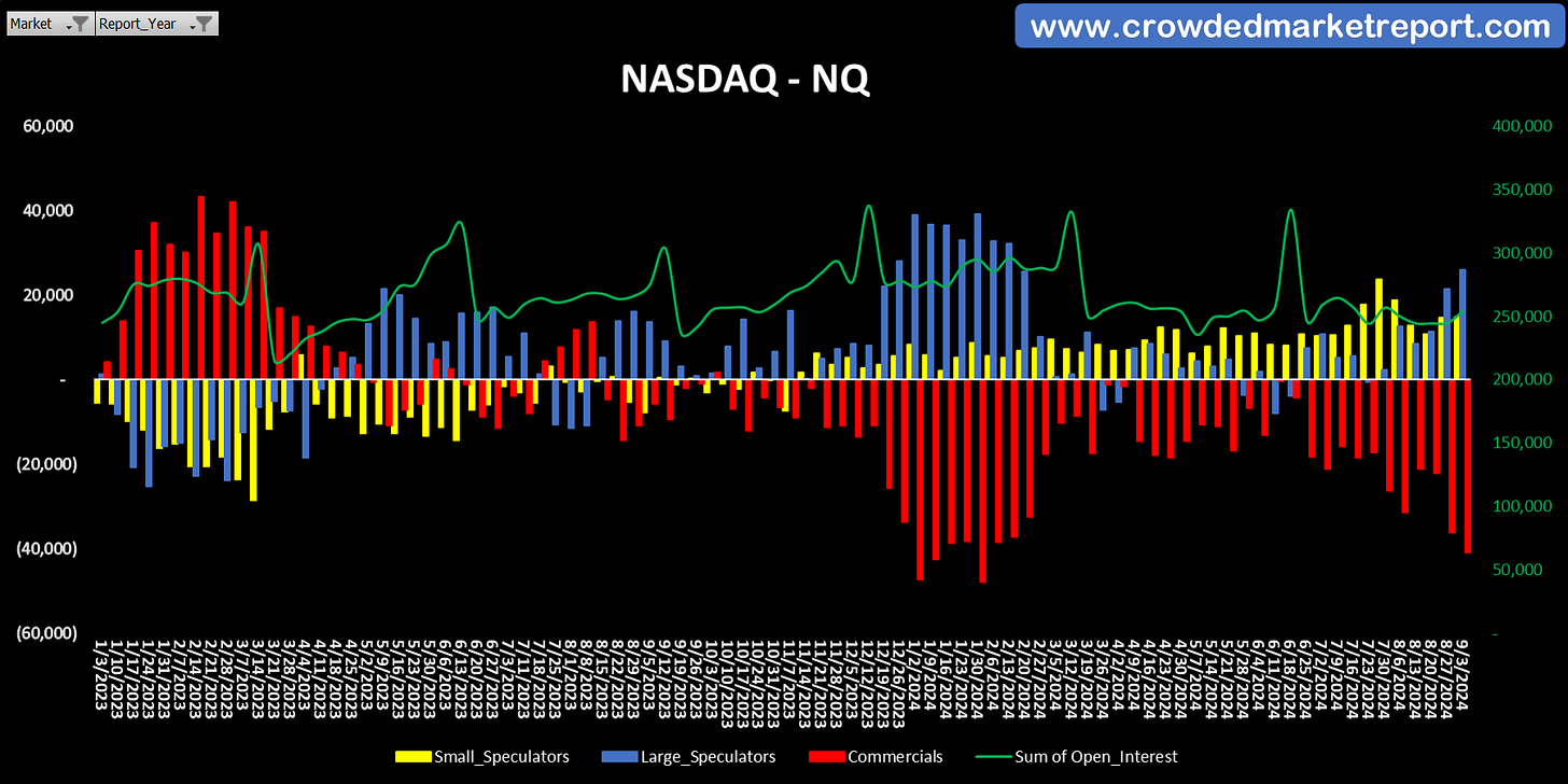 A few weeks back we highlighted that Speculators were starting to buy the dip and have now committed to buying the Nasdaq aggressively. The Nasdaq has been the worst performing index the last month and has lead the market correction down. With the Fed rate cut decision next week, does the stock market have any fuel left to make new highs in 2024, or did we top already. Especially when you look at the potential news failure in August when NVIDIA reported bullish earnings and it failed to close green, and so did the Nasdaq. Proceed with caution…