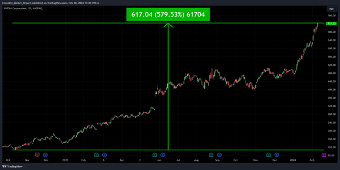 So, which one is it? Is Nvidia about to go up thirty times or has it already done that? Of course, I have no way of knowing. I am just trying to point out here that price moves in a bubble can be absolutely astonishing and trying to pick the top of the bubble again and again can be extremely dangerous. What I do know is that I have heard more stories in the past year about traders that have lost a lot of money trying to short Nvidia than I have heard stories about traders that are getting rich off this move. This is much different than the previous two bubbles I mentioned where I only heard about how rich everyone was getting so quickly. So many people are still around that remember the 2000 bubble, and many more who got burned in the 2022 bear market, that there seems a hesitancy to be a bag holder this time around.
