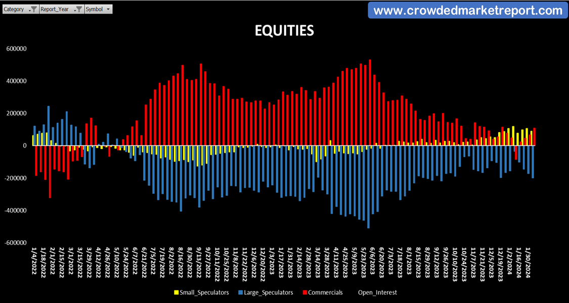 This positioning is straight up insane with the stock market on all-time highs. Large Speculators (blue column) increased their net-short positioning week over week right before the markets continued higher reaching new records by the end of the week. Small Speculators did the same, even though they remain net-long, they covered some of those longs and were sellers last week.